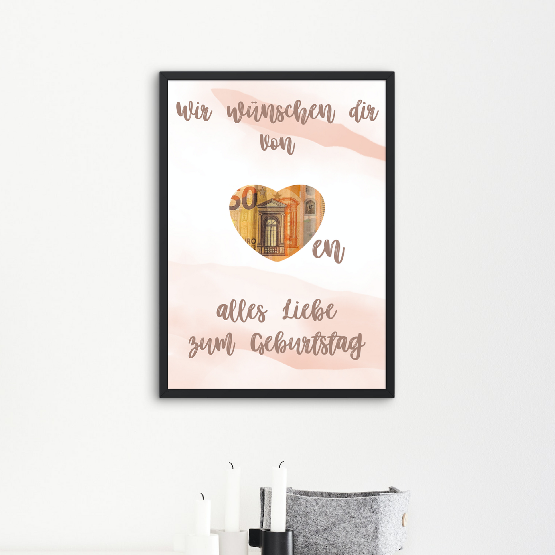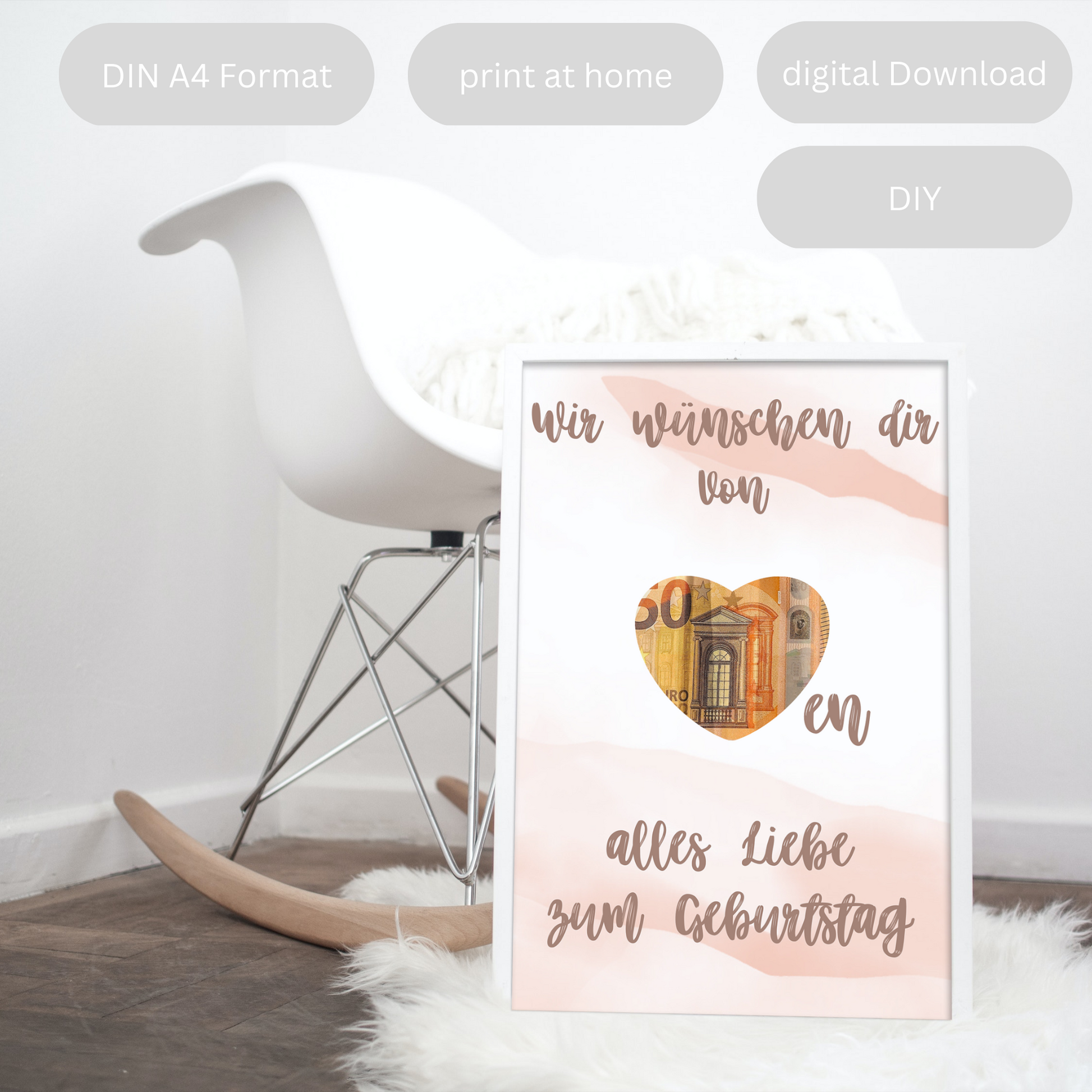 Das freundliche Design in den Farben rosa, rosegold und weiß strahlt pure Lebensfreude aus. Im Mittelpunkt des Posters steht ein großes Herz, das die bedingungslose Liebe und Zuneigung symbolisiert. Dieses Herz bietet jedoch noch mehr: Nach dem Ausdrucken kannst du es ausschneiden und von hinten mit Geldscheinen bekleben. Mit nur wenigen Handgriffen und einer Prise Kreativität wird es dadurch zu einem einzigartigen, selbstgemachten Geschenk, das eine ganz persönliche Note trägt.